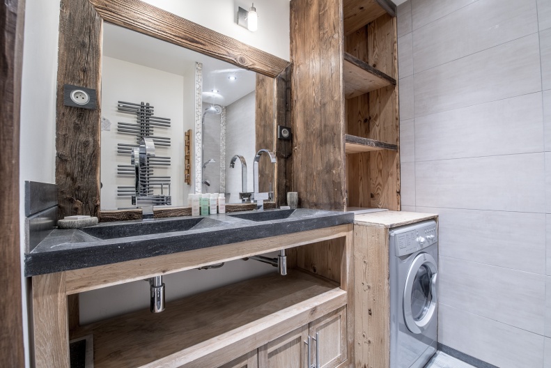 - Salle de douche avec double vasque et machine à laver