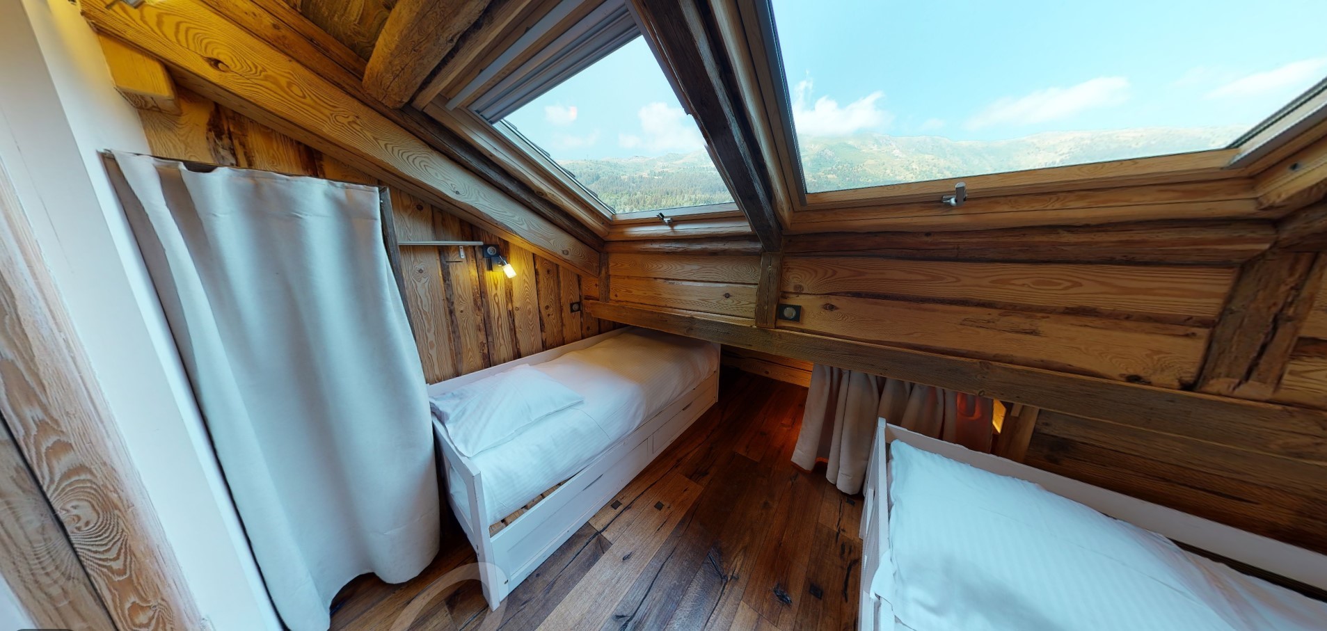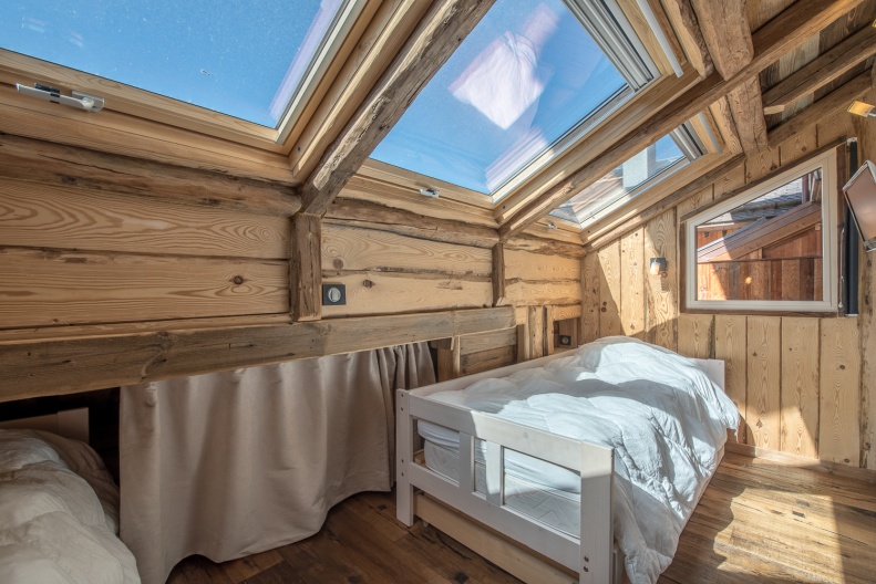- Chambre 2 : deux lits simples (80 cm) avec fenêtres et Velux, rangements et télévision