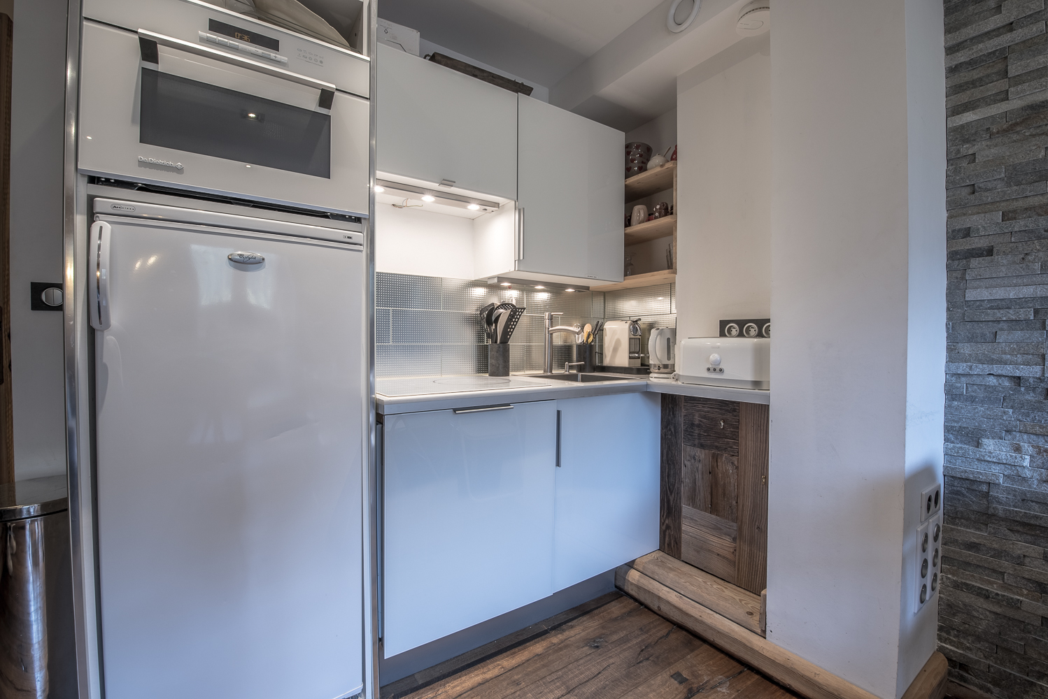 - Cuisine ouverte avec plaques induction, four, mircro-ondes, lave-vaisselle et machine à café Nespresso