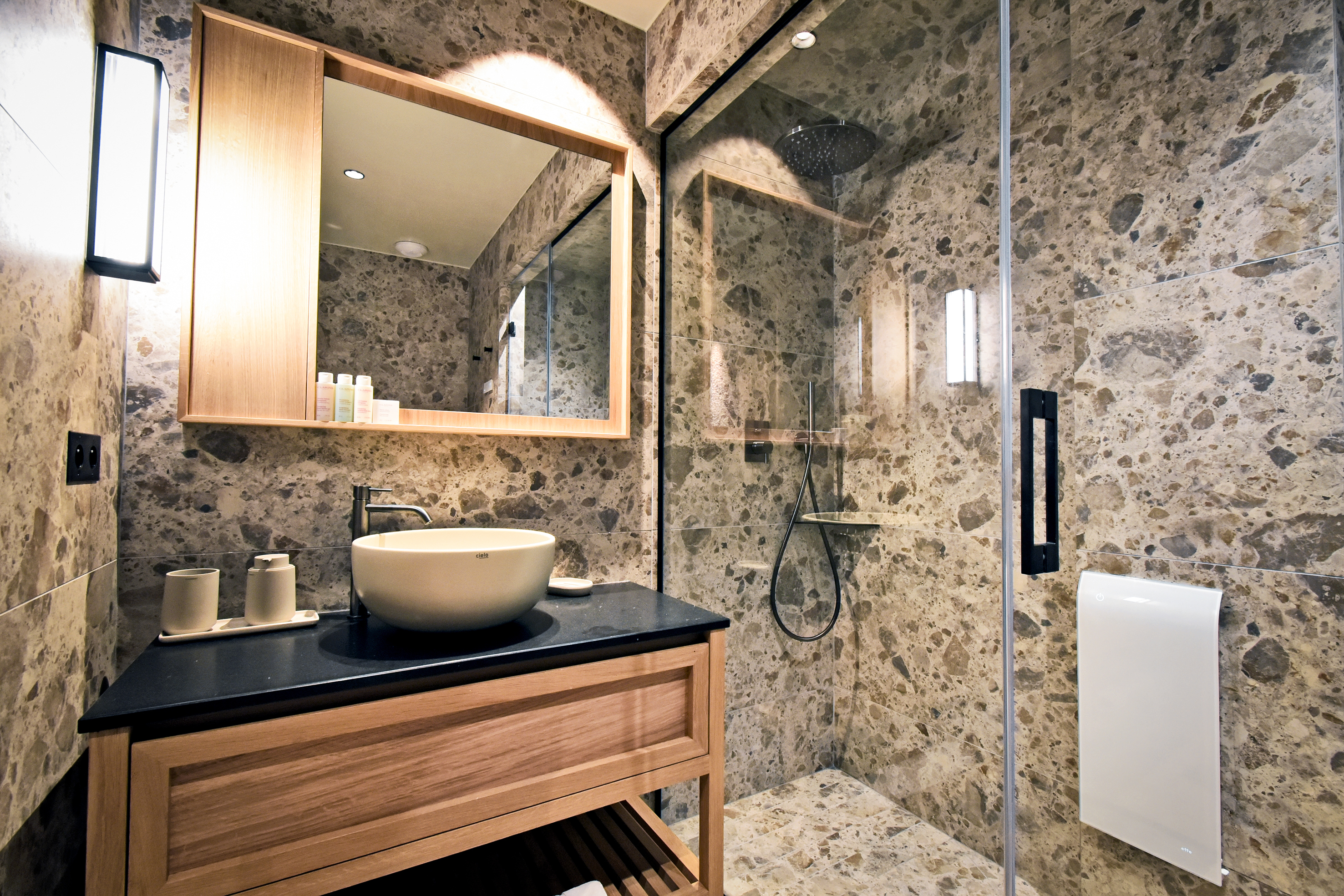 - Chambre 1 : Lit double avec 1 salle de douche avec système Hammam & 1 vasque - balcon
