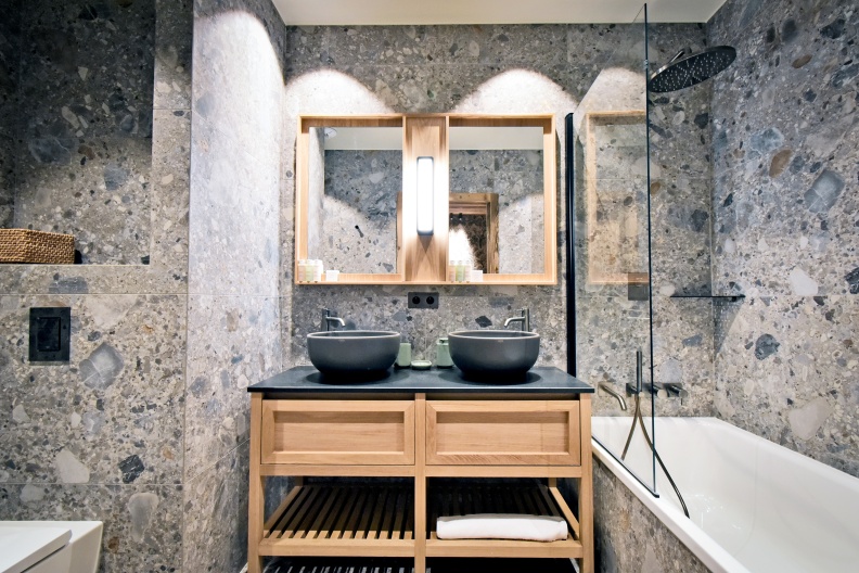 - 1 salle de bain avec baignoire, 2 vasques et 1 WC