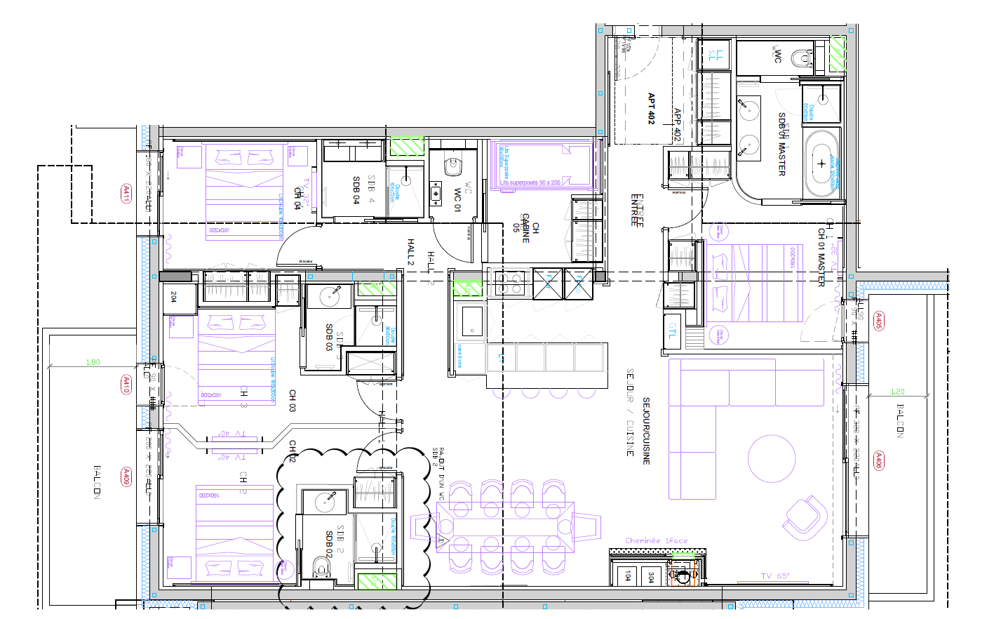 - Chambre 1 / Master : lit double, TV, accès balcon Ouest, salle de bain avec baignoire, double vasque et toilettes