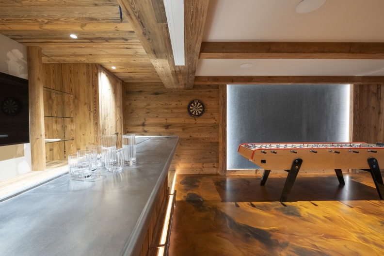 Le rez-de-chaussée est consacré aux loisirs avec un ski-room, équipé de racks à skis, sèche-chaussures et dressings pour vos équipements. Vous pourrez également profiter d’un espace bien-être avec une piscine à nage, un sauna, un hammam et un bain froid à 8°C. Le sauna, doté d’un mur de briques de sel de l'Himalaya, vous invite à des séances d'halothérapie.