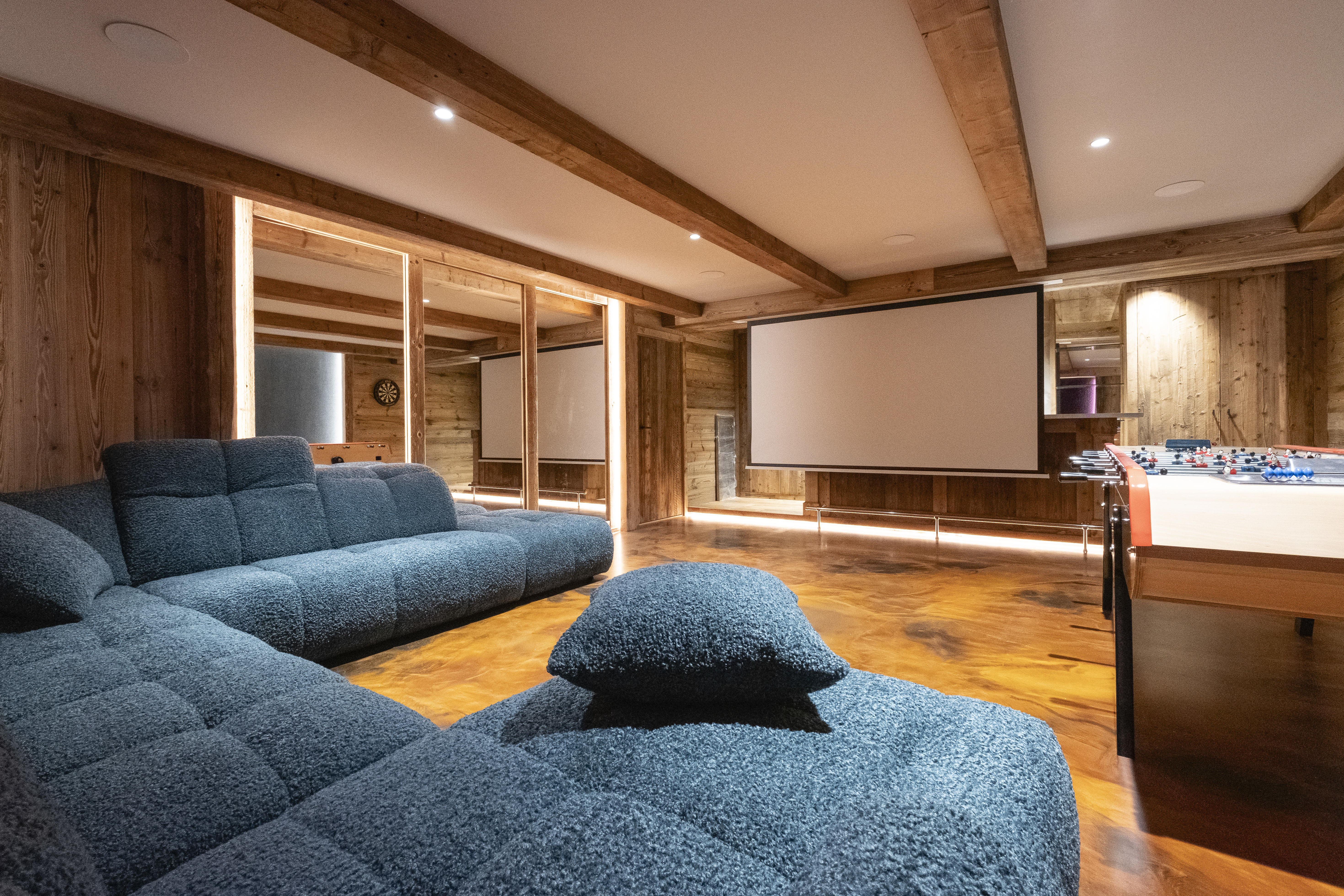 Au sous-sol, une salle de massage zen aux murs aromatiques et une play-room multifonction offrent un cadre idéal pour la détente et les loisirs. Un babyfoot géant (jusqu’à 8 joueurs) et une PlayStation complètent l’équipement de cet espace ludique.
