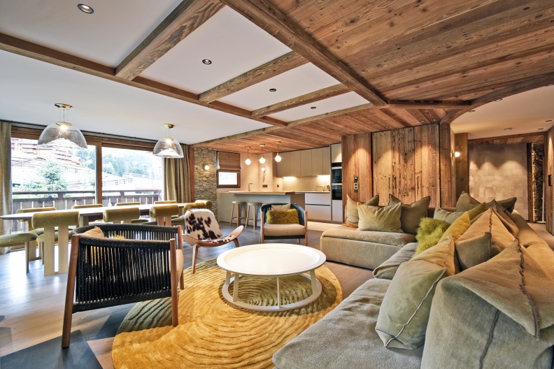 - de larges pièces de vie comprenant une cheminée, une grande table à manger ainsi que de longs canapés invitant à la détente après une longue journée d’activités à Méribel ;